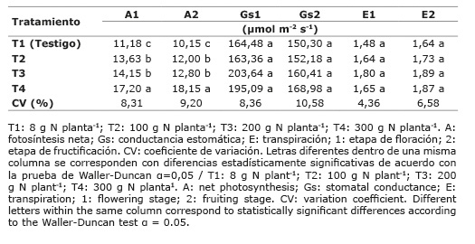 Los resultados de la presente investigación demostraron que los mayores valores de fotosíntesis neta se encontraron en el tratamiento T3, y disminuyeron progresivamente mientras menor fue la dosis aplicada de N en las plantas, con los menores valores en el tratamiento testigo (8 g N planta-1).