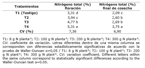 Los valores de contenido de nitrógeno al momento de floración y cosecha se presentan en el Cuadro 4.