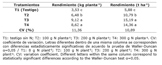 Las plantas con dosis de 200 g N planta-1 (T3) presentaron el mayor rendimiento en comparación con el resto de los tratamientos, lo cual sugiere que la dosis más alta de nitrógeno evaluada no necesariamente implique mayor productividad.