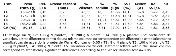 Dentro de los aspectos evaluados de calidad, el peso promedio del fruto fue la única variable que presentó diferencias estadísticamente significativas entre los tratamientos estudiados, tanto para los parámetros físicos como químicos de calidad. Se mantuvo la tendencia en T3 de presentar los mayores valores, seguido de T4, T2 y T1, respectivamente. No obstante, los valores de peso del fruto obtenidos, incluso en el testigo, fueron superiores a los reportados en otras investigaciones en el país (Aular y Casares, 2011; Pérez y Melgarejo, 2012) donde se han encontrado valores entre 100 y 130 g fruto-1; lo cual indica que, con respecto al tamaño del fruto, no se produjeron resultados desfavorables en cuanto a calidad física se refiere. Por su parte, Álvarez et al. (2018) reportaron en su investigación que las fuentes nitrogenadas urea (CH4N2O), nitrato de calcio Ca(NO3)2, nitrato de potasio (KNO3) y nitrato de amonio (NH4NO3), produjeron un grosor de cáscara de 5 mm y no hubo diferencias significativas en el porcentaje de la pulpa.