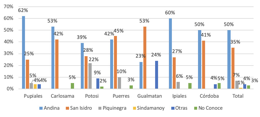 El 50 % de los agricultores reportaron que la variedad de arveja más utilizada para la siembra en la zona de estudio correspondió a la denominada Andina. Por sus características fue la más aceptada por los agricultores y comerciantes, porque el grano es más brillante y más resistente al transporte. En segundo lugar, se ubicó la variedad San Isidro con el 35 %, y los agricultores la prefirieron porque obtienen vainas desde los primeros entrenudos en el tallo, la vaina es más larga y facilita la extracción de semillas para las próximas siembras. También reportan otras variedades, como la Piquinegra con el 7 % y Sindamanoy con 1% (Figura 1).
