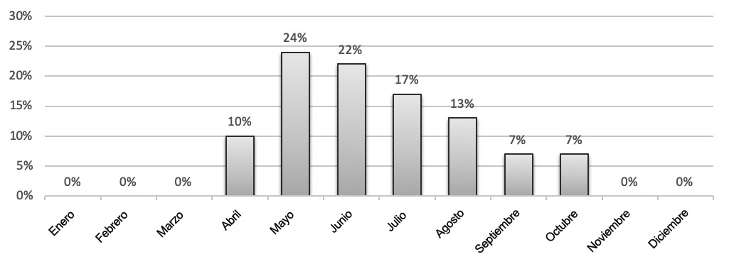 El 86,93 % de los agricultores sembraron arveja motivados por los precios de venta. Por lo general, las siembras se realizaron entre los meses de enero a marzo, y la época de mayor cosecha se ubicó entre los meses de mayo y agosto; el mes de mayo fue el que registró mayor cosecha con el 24 %, luego se ubicaron los meses de junio con 22 % y julio con 17 % (Figura 2).