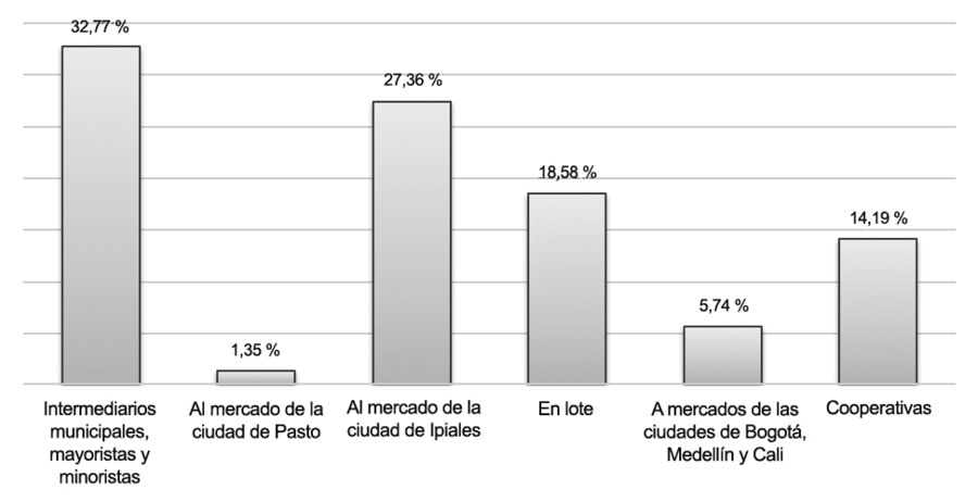 El mayor volumen de la producción de arveja en la zona de estudio se vendió directamente en la fincas de los agricultores a los intermediarios municipales, mayoristas y minoristas; en su orden, otros volúmenes de producción se comercializaron en las plazas de mercado de Ipiales, a través de cooperativas, en lotes de terreno sin cosechar, a mercados de las ciudades de Bogotá, Medellín y Cali, y un pequeño volumen al mercado de la ciudad de Pasto. El destino y porcentajes comercializados de arveja en la zona de estudio se muestra en la Figura 3.