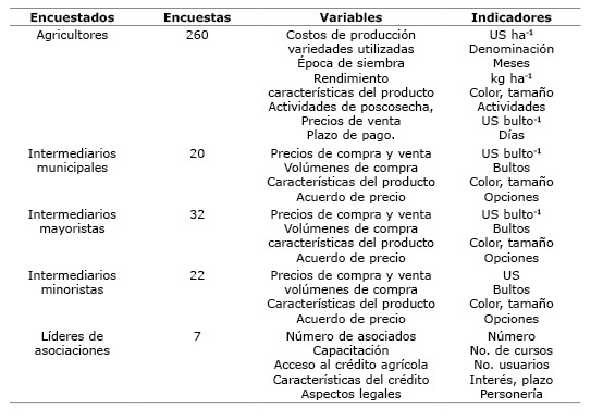 La investigación recopiló información de: agricultores, intermediarios municipales, que comercializan la arveja a nivel intermunicipal, intermediarios mayoristas, se refiere a los que comercializan hacia otros departamentos, intermediarios minoristas son los que comercializan en las plazas de mercado, y líderes de asociaciones de los siete municipios productores de arveja. La recolección de la información primaria se llevó a cabo mediante el método probabilístico y se empleó la ecuación 1 (Hernández et al., 2014) para determinar el número de encuestas.