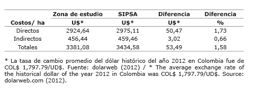 Los costos totales promedio de producción del cultivo de arveja en la zona aumentaron a U$ 3381,08, los cuales fueron similares a los reportados por el Sistema de Información de Precios del Sector Agropecuario (SIPSA); no obstante, presentaron diferencias mínimas del 1,58 % (Cuadro 2). Del total de costos, el 86,5 % correspondieron a costos directos y el 13,50 % a costos indirectos.