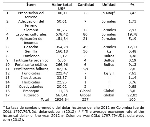 Table 2. Average production costs of pea (Pisum sativum L.), in seven municipalities of the southern area of the department of Nariño: Ipiales, Pupiales, Cordoba, Potosi, Carlosama, Puerres, and Gualmatan. Colombia. 2012.