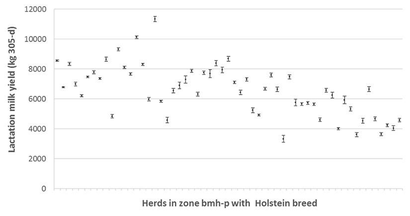 Similar appreciations can be obtained regarding milk production per lactation (Figure 7), where the Holstein breed presents a marked superiority on the three agro-ecological zones. Differences up to 2000 kg can be observed amongst the different breeds within the same agro-ecological zone. In the same way, the yield of the Holstein breed in a low zone (bmh_t) was almost 1000 kg less than in the intermediate zone (bmh-p).