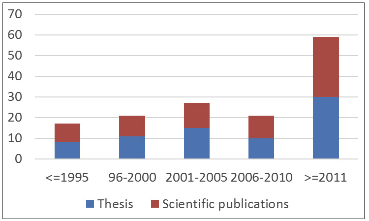 Figura 10. Número de tesis y publicaciones científicas producidas a partir de la base de datos VAMPP®. Costa Rica. Periodo 1987-2018.