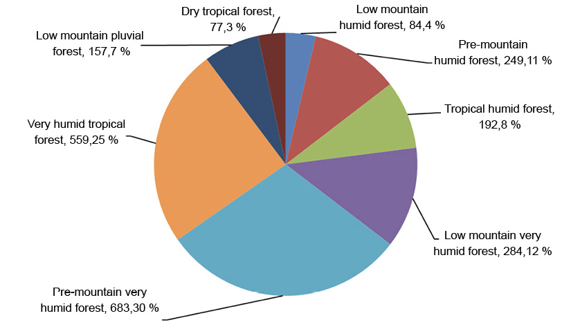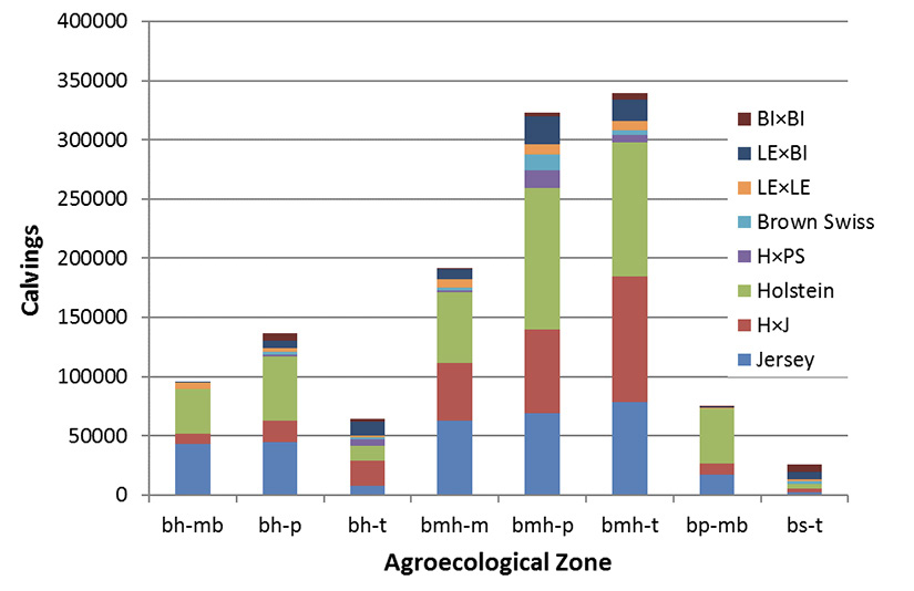 The most of calvings records in the information system came from the very humid pre-mountain (bmh-p, 25.8%) and tropical (bmh-t, 27.2 %) forests, and most of them corresponded to breeds Holstein (35.8 %) and Jersey (26.1 %), or crosses Holstein×Jersey (22.9 %) (Figure 4). There was also information regarding other dairy and beef breeds, but in lower numbers.