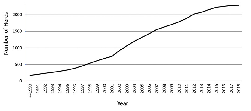 Since the beginning of the project in the late 1980s, the entry of farms into the system showed a non-linear growth pattern, with a higher rate of entry between the years 2002-2012 (Figure 3). For herds in the database, the number of adult cows was a highly-skewed variable with a mean of 124±245 (median= 40 cows). Average number of follow up years for herds in the system was 9.4±7.9 (median= 7.0 yr). Herds with information updated to the last year (2018) represent about 26.8% of the total numbers of herds with information in the database.