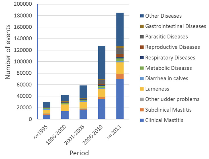 There were 443 108 health-related events recorded in the database, most frequently related to mastitis (35.6 %) and lameness (14.1 %), and to a much lesser extent reproductive diseases (Figure 5). Less common infectious diseases (stomatitis, anaplasmosis, leptospirosis) were pooled in one group as “other diseases”, with a frequency of 35.4 %. Other health events (respiratory, metabolic, gastrointestinal, etc) were available in lower numbers. Number of health-related events recorded in the database increased in time, mainly due to the inclusion of new herds in the system.