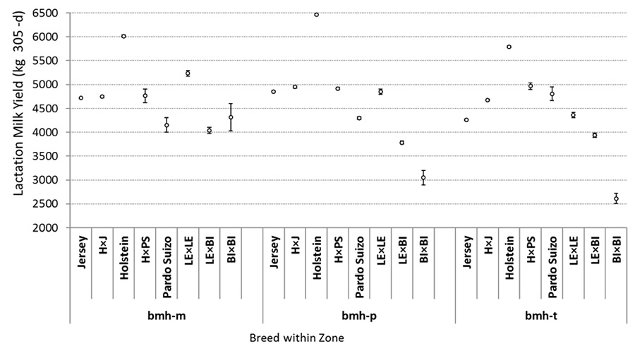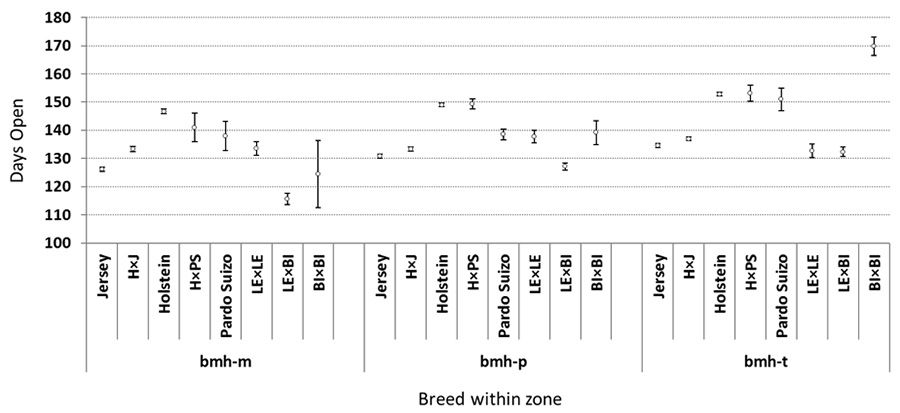The information available has been used to obtain population statistics by breed and zone for different productive and reproductive parameters, such as days open (Figure 6). Performance of different breeds within the same zone, or the same breed in different zones, can be appreciated. For example, a consistent difference of about 20 days open less in the Jersey breed compared with the Holstein breed is observed for the three zones (bmh_t, bmh_p, bmh_m). In the lowest and hottest zone (bmh_t) there were up to 8 more days open for Holstein and Jersey in comparison with the highest and coolest zone (bmh_m). Days open in the Holstein×Jersey cross were lower than the average of parental breeds.