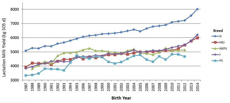 - Time trends by breed for the 305-d milk yield.