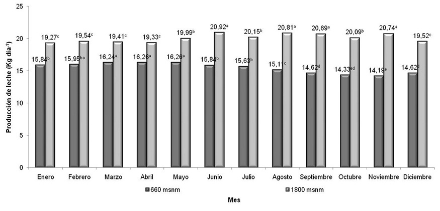 El promedio de producción de los años evaluados del sistema de producción láctea ubicado a 660 msnm fue de 15,23 kg leche-1día-1 y de 19,95 kg leche-1día-1 para los animales desarrollados a una altitud de 1800 m (Cuadro 7). Al comparar los sistemas productivos durante años similares (2011-2012-2013-2014), se obtuvo que la producción promedio de leche por día por animal fue de 16,50±0,34 kg y de 20,20±0,89 kg a 660 y 1800 msnm, respectivamente. La producción láctea promedio de las vacas estuvo afectada significativamente de un mes a otro durante el año (p<0,05). El promedio de producción mensual fue de 15,41 kg leche-1día-1 y de 20,4 kg leche-1día-1 para los sistemas a 660 y 1800 msnm, respectivamente. En la Figura 1 se muestran las dos tendencias en la producción láctea en cada sistema durante el año. A la altitud de a 660 m se observó que, en los primeros cinco meses del año (enero-mayo), hubo las mayores producciones promedio, donde la máxima se alcanzó en los meses de abril y mayo (16,26 kg leche-1día-1); en cambio, el sistema localizado a 1800 msnm registró un aumento en el volumen de producción en los últimos seis meses del año (junio-diciembre), período en el que se alcanzó el pico de producción en el mes de agosto, con un valor de 20,81 kg leche-1 día-1.