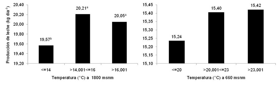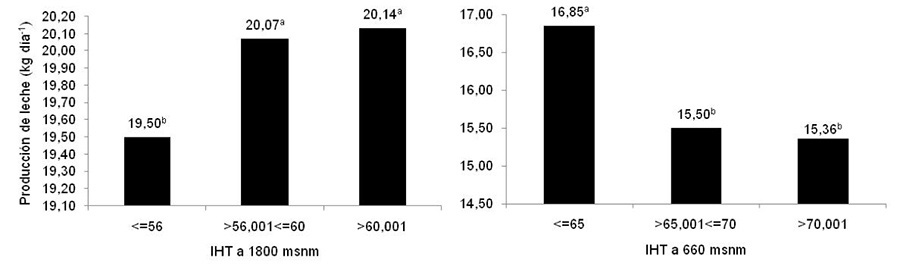 Según lo determinado en esta investigación (Cuadro 1), el sistema de producción ubicado a 1800 msnm presentó 7,23 °C menos, 9,3 % más de HR, una menor incidencia de radiación (4,26 MJ m-2) y 12,29 puntos menos en el IHT, diferencias que afectaron la productividad de los animales. En aspectos genéticos, el sistema ubicado a 1800 msnm, como única escogencia en el programa de inseminación que implementan, se utilizó el animal que se encuentra con mejor calificación de tipo y conformación para la raza jersey, según la evaluación internacional.