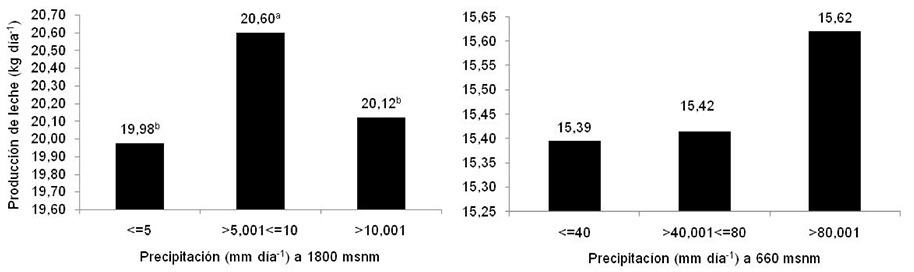 Para el hato ubicado a 660 msnm, los valores de producción láctea no presentaron diferencias significativas (p>0,05) según el rango de temperatura analizado (Figura 2). Para la ubicación de 1800 msnm, existió una diferencia significativa en la producción láctea de los animales a temperaturas menores a 14 °C, la cual tendió a disminuir, ya que el mayor potencial productivo de las vacas estuvo entre los 14 y 16 °C, con una producción promedio por animal por día de 20,21 kg leche-1 día-1. La producción de leche alcanzó su punto máximo cuando los valores de precipitación superaron los 80 mm día-1 en el sistema a 660 msnm (Figura 3). Existió una diferencia significativa entre la precipitación y la producción láctea para el sistema ubicado a 1800 msnm, donde se registró la mayor producción (20,6 kg de leche diarios) cuando se presentaron entre los 5 y 10 mm día-1. Valores inferiores o iguales a 5 mm día-1 provocaron una disminución de 0,62 kg de leche diarios respecto del rango situado entre los 5 y 10 mm día-1 (Figura 3). De igual manera, se observó una disminución de 0,48 kg de leche diarios cuando la precipitación presentó valores superiores a 10 mm día-1.