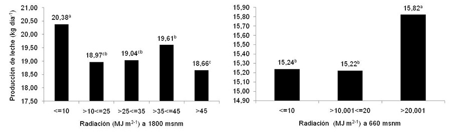 Con respecto a la evaluación de la radiación en ambos sistemas, esta presentó un efecto diferente según el piso altitudinal, a 660 msnm se registró un aumento de 0,60 kg de leche diarios en rangos de radiación superiores a 20 MJ m-2, en cambio, a 1800 msnm el máximo valor de producción se alcanzó cuando la radiación fue menor o igual a 10 MJ m-2 (Figura 4).