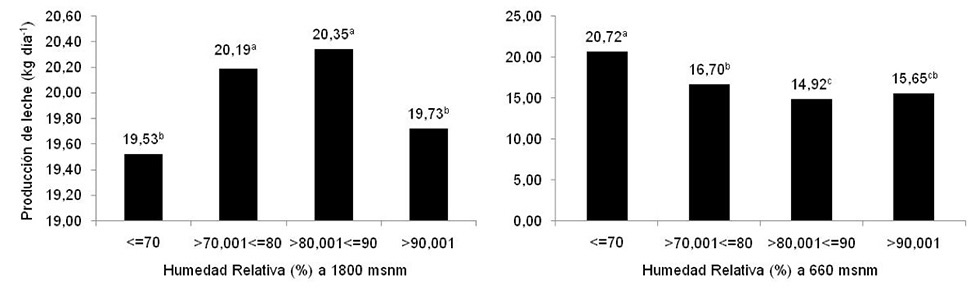La producción de leche a 660 msnm alcanzó su máximo valor cuando la HR fue menor o igual a 70 % y disminuyó cuando la HR superó el 80 % (Figura 5). Cuando la HR pasó de 70 a 90 %, los animales dejaron de producir 5,07 l de leche, o redujeron la productividad en 169 ml de leche por día por cada aumento porcentual en el contenido de humedad del aire. La producción de leche a 1800 msnm alcanzó su máxima producción promedio en valores de humedad relativa mayores a 80 % y menores o iguales a 90 % (Figura 5). Se observó que los mínimos valores de producción se presentaron en el rango de humedad relativa menor o igual a 70 % y mayor a 90 %. Entre los rangos de 70 y 80 %, y del 80 al 90 % de humedad, se registró un aumento en el promedio de producción de 0,15 kg de leche diarios (p<0,05); pero cuando la humedad superó el 90 %, se registró una disminución de 0,62 kg de leche diarios.