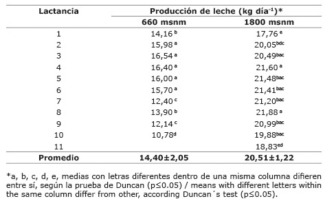 Con base en la producción láctea de animales jersey según el número de lactancia en dos pisos altitudinales (Cuadro 7), se mostró que los semovientes a 1800 msnm, presentaron mayor producción y vida productiva, situación que se denotó, al comparar la productividad de animales con más de diez lactancias, con promedios de producción, que superaron en 2,29 l de leche por día a los animales de tercera lactancia a 660 msnm, donde, en lactancias superiores a 250 días, se obtuvieron 572,5 l de leche de más en cada ciclo productivo. En el caso del sistema a menor altura, permite implementar un sistema de selección de animales, con la meta de obtener la mayor productividad de los animales presentes, debido a que la vida productiva de las vacas no podría superar los diez años, ya que producen menos leche al día y compiten por forraje y alimento balanceado con animales de menor edad y mayor producción. Para el sistema de mayor altura, la constancia en el promedio de producción por animal entre lactancias, podría indicar problemas de manejo propios del sistema a nivel nutricional o una barrera natural que limita el potencial de los animales que pastorean forrajes tropicales, debido a que, según Carvajal et al. (2002), la mayor producción de leche se obtiene entre la tercera y la quinta lactancia, momento en el cual la vaca alcanza su peso adulto.