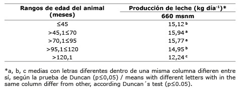 Table 9. Relationship of the animal age and the dairy production of jersey animals located at 660 m.a.s.l. Turrialba, Cartago, Costa Rica. 2016.