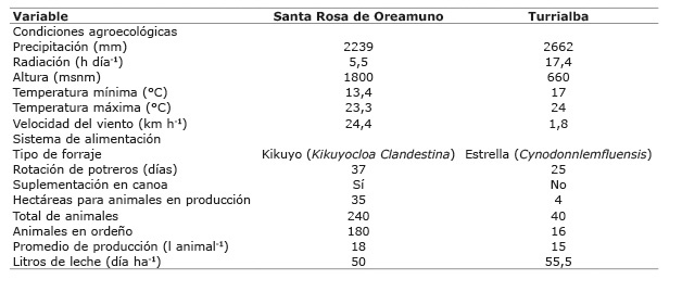 La investigación se realizó en la provincia de Cartago Costa Rica, en las localidades de Santa Rosa (1800 msnm) y en Turrialba (660 msnm). Santa Rosa es un distrito del cantón de Oreamuno, Cartago, que se ubica en la sección oriental del Valle Central (latitud 09°54´, longitud 83°49´). Esta región se caracteriza por tener influencia climática del Caribe y poseer bosque húmedo tropical premontano, alta humedad, presencia de neblina y bosque primario y siempreverde, de dos estratos (Quesada, 2007). El segundo sistema de producción, se encuentra en Turrialba, en la Sede del Atlántico de la Universidad de Costa Rica, denominada Módulo Lechero; unidad dedicada a la investigación, la acción social y la docencia de dicha institución. Se ubica en el distrito central (latitud 09°88´, longitud 83°60´), posee clima lluvioso, con bosque muy húmedo subtropical de media altura siempreverde, de dos o tres estratos (Quesada, 2007). En el Cuadro 1, se resumen las características agroecológicas y de manejo promedio que se realizaron en los sistemas de producción, donde se recopiló, ordenó y analizó la información durante el año 2016.