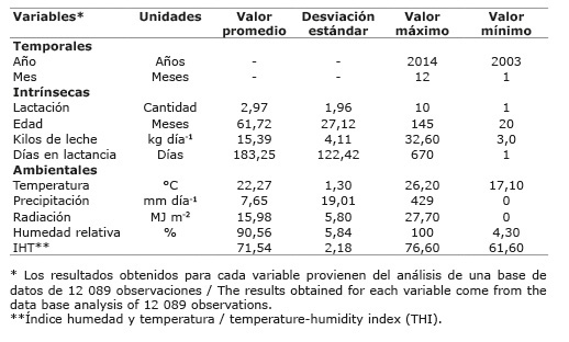 En los Cuadros 2 y 3 se describen las variables evaluadas en esta investigación, consideradas como temporales (año y mes), intrínsecas del animal y ambientales, de igual manera, se describen las medidas de dispersión que se encontraron para cada variable, como lo son el promedio, la desviación estándar y los valores máximos y mínimos utilizados.