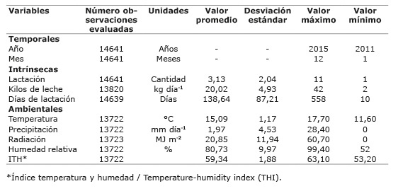 La información base para este estudio comprende los datos meteorológicos y productivos recolectados desde el año 2003 al 2014 para la finca que se encuentra a 660 msnm, y desde el año 2011 al 2015 para el caso de Santa Rosa. Se analizó la información de 61 animales para el sistema a 660 msnm durante doce años y se obtuvieron 12 089 observaciones. En cuanto al sistema a 1800 msnm, se analizaron 387 animales y se obtuvieron 13 820 observaciones en cinco años. Tal diferencia en los períodos de recolección de datos se sustenta en el número de registros evaluados, pues para cada registro adquirido en el sistema de producción en Turrialba, se obtuvieron seis en el sistema productivo de Santa Rosa.