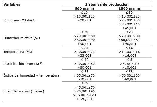 A la hora de relacionar las variables ambientales con la producción de leche, se procedió a generar rangos con base en la dispersión de los datos en cada variable (Cuadro 4).