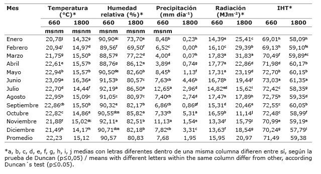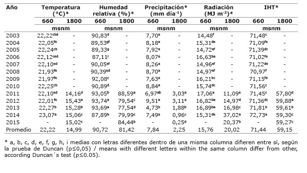La radiación presentó valores promedio de 15,76 MJ m-2 y de 20,09 MJ m-2 para los sistemas de producción ubicados a 660 y 1800 msnm, respectivamente. A 660 msnm se presentó un máximo de radiación de 17,06 MJ m-2 en el 2011 y un mínimo de 14,48 MJ m-2 durante el 2003 (p<0,05). En cambio, a 1800 msnm se registró un aumento en los valores de la radiación desde el 2011 hasta el 2014, con un valor mínimo de 11,09 MJ m-2 y un máximo de 37,02 MJ m-2. La fluctuación mensual de la radiación reveló que marzo fue el período del año con la mayor radiación en ambos sistemas, y noviembre y octubre fueron los meses con menor radiación registrados para los sistemas a 660 y 1800 msnm, respectivamente (Cuadro 6). En la altitud de 660 m se registró una mayor temperatura y humedad relativa en relación con la altitud de1800 m, lo cual concuerda con el IHT promedio determinado para cada uno, de 71,44 y 59,18, respectivamente (Cuadro 5).