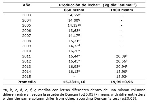 La diferencia promedio de 3,7 kg leche-1 día-1 por animal entre los sistemas productivos (2011 al 2014) se podría explicar por los días de lactancia promedio del hato, el manejo alimenticio, los problemas reproductivos (Lucy, 2001) y por las condiciones ambientales presentes en cada ecosistema (Pérez y Gómez, 2005), las cuales se relacionan con la altitud y con el tipo, la oferta y la calidad nutricional del forraje que se les suministra al ganado.