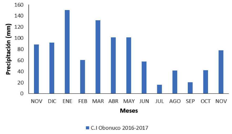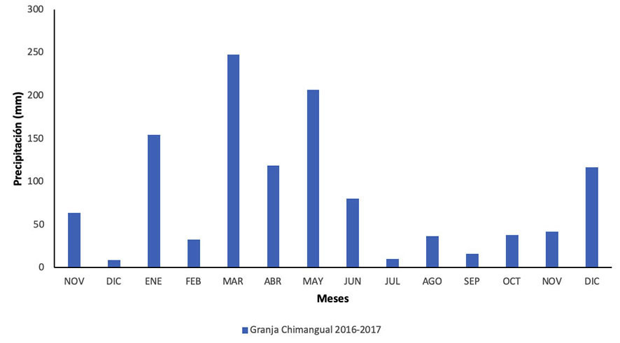Figure 1. Accumulated precipitation from November 2016 to November 2017, Vintage station pro 2, located at the C.I Obonuco research station of the Corporacion Colombiana de Investigacion Agropecuaria (AGROSAVIA). Pasto, Colombia.