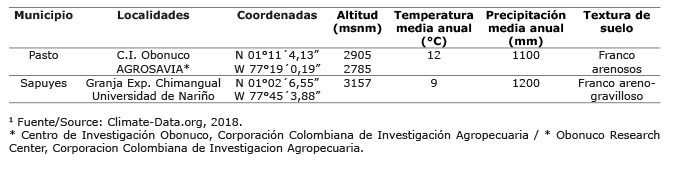 El estudio para caracterizar y evaluar diez cultivos forrajeros se llevó a cabo entre noviembre 2016 y setiembre 2017, en tres localidades del departamento de Nariño, Colombia. Las localidades 1 y 2 (L1 y L2) se ubican en el Centro de Investigación Obonuco de la Corporación Colombiana de Investigación Agropecuaria (AGROSAVIA), municipio de Pasto, con alturas de 2905 msnm y 2785 msnm, respectivamente, con una temperatura y precipitación promedio anual en las dos localidades de 12 °C y 1100 mm, clasificadas como bosque seco montano bajo (Holdridge, 1982) datos obtenidos de la estación ganadera, de AGROSAVIA entre el año 2016 y 2017. La localidad 3 (L3) se ubica en la granja experimental Chimangual de la Universidad de Nariño, municipio de Sapuyes, con una altura de 3157 msnm, temperatura promedio de 9 °C y precipitación promedio anual de 1200 mm (Cuadro 1), se clasifica como una zona de bosque húmedo montano (UDENAR, 2016).