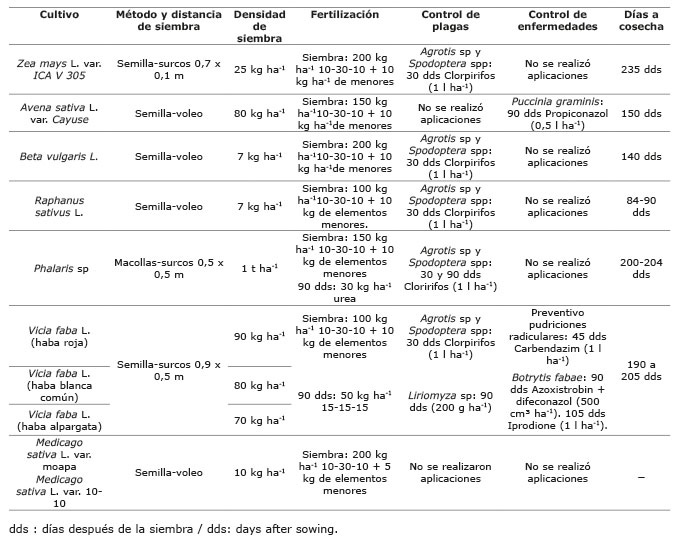 La siembra de todos los tratamientos se realizó en el mes de noviembre de 2016 (80 mm). Los cultivos de avena, alfalfa y rábano forrajero se sembraron con semilla sexual y al voleo; mientras que el maíz, la remolacha forrajera y la haba se sembraron con semilla sexual, y con distancias que variaron entre surcos de 0,7 m y 0,9 m y entre plantas de 0,2 m a 0,5 m. El pasto brasilero se sembró con semilla asexual (macollas) con distancias entre surcos 0,5 m y entre plantas 0,5 m. Durante el establecimiento y desarrollo de los cultivos, se realizó el manejo agronómico (fertilización, control de arvenses, manejo de plagas y patógenos) acorde a recomendaciones técnicas de cada cultivo. La cosecha se realizó de acuerdo con la etapa fenológica óptima para cada cultivo (Cuadro 2).