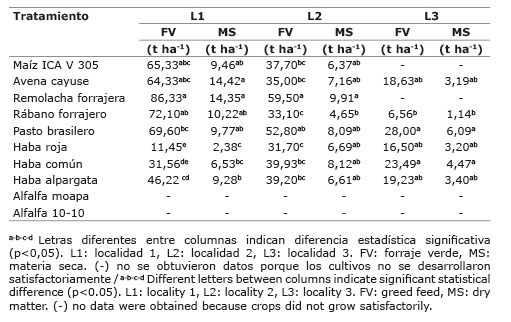 Se observaron diferencias estadísticas significativas (p<0,05) entre los tratamientos de cada localidad (Cuadro 3). En la L1 y L2 se observó mayor rendimiento de FV para la remolacha forrajera (86,33±5,12 y 59,50±3,63 t ha-1, respectivamente), por el contrario, en la L3 fue el pasto brasilero (28,00±3,92 t ha-1); sin embargo, el rendimiento de MS fue diferente, los mayores valores se presentaron en la avena cayuse (14,42±1,01 t ha-1), la remolacha forrajera (9,91±0,86 t ha-1) y el pasto brasilero (6,09±0,60 t ha-1) de las L1, L2 y L3, respectivamente.