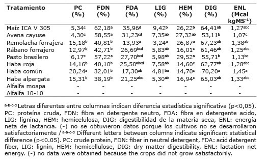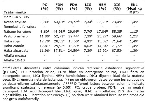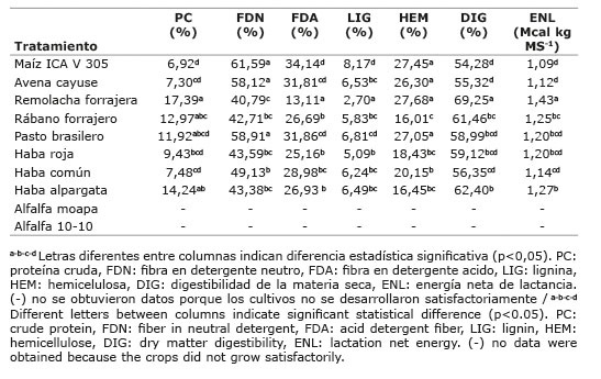Table 5. Average of nutritional variables evaluated in ten forage crops in the L2 locality in the Obonuco Research Center of the Corporacion Colombiana de Investigacion Agropecuaria (AGROSAVIA), municipality of Pasto. Colombia. 2016-2017.