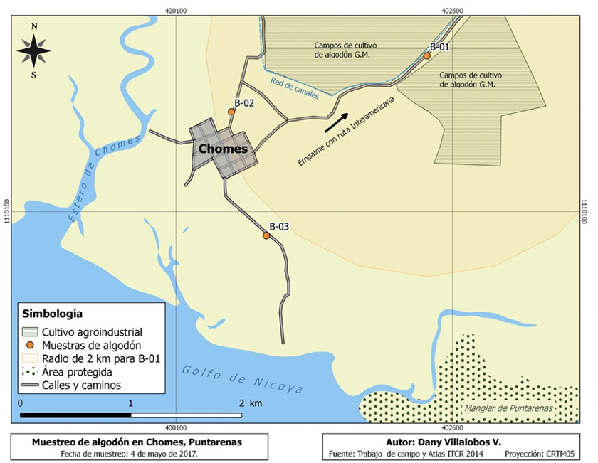 Se analizaron veinticuatro muestras de ADN obtenidas por Carvajal et al. (2017) en agosto de 2016 a partir de alimentos sólidos de consumo, tanto humano como animal, con o sin ingredientes de maíz o soya en su fabricación. Los alimentos se obtuvieron de establecimientos comerciales de las provincias de Heredia, Cartago y San José en abril de 2016; además de distribuidores internacionales. También, se analizó una muestra de tortillas tostadas orgánicas producidas en Costa Rica, así como el maíz y la masa utilizada para su manufactura. Adicionalmente, se analizaron semillas provenientes de motas (fibra vegetal) de plantas de algodón (Gossypium sp.) colectadas en mayo del 2017, en tres puntos de muestreo cercanos a un cultivo agroindustrial de algodón GM ubicado en el distrito de Chomes, Puntarenas, en suelo o cercano a domicilios residenciales (Figuras 1 y 2).
