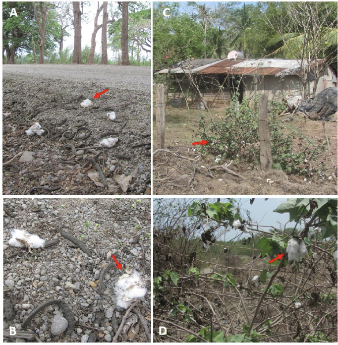Figure 2. Locations where cotton seeds (Gossypium sp.) samples were obtained in Chomes district, Puntarenas, May of 2017. A-B) Main public road between GM cotton fields, collection point B-01. C) Cotton plant seeds located next to the garden fence of a private home in Chomes, collection point B-02. D) Wild cotton plant seeds (commonly called by the locals as mountain cotton) that adjoin the mangrove area, next to a public path leading to Chomes estuary, sample collection B-03. The arrows denote the cotton specks collected for real-time PCR analysis in order to detect traces of transgenic sequences.