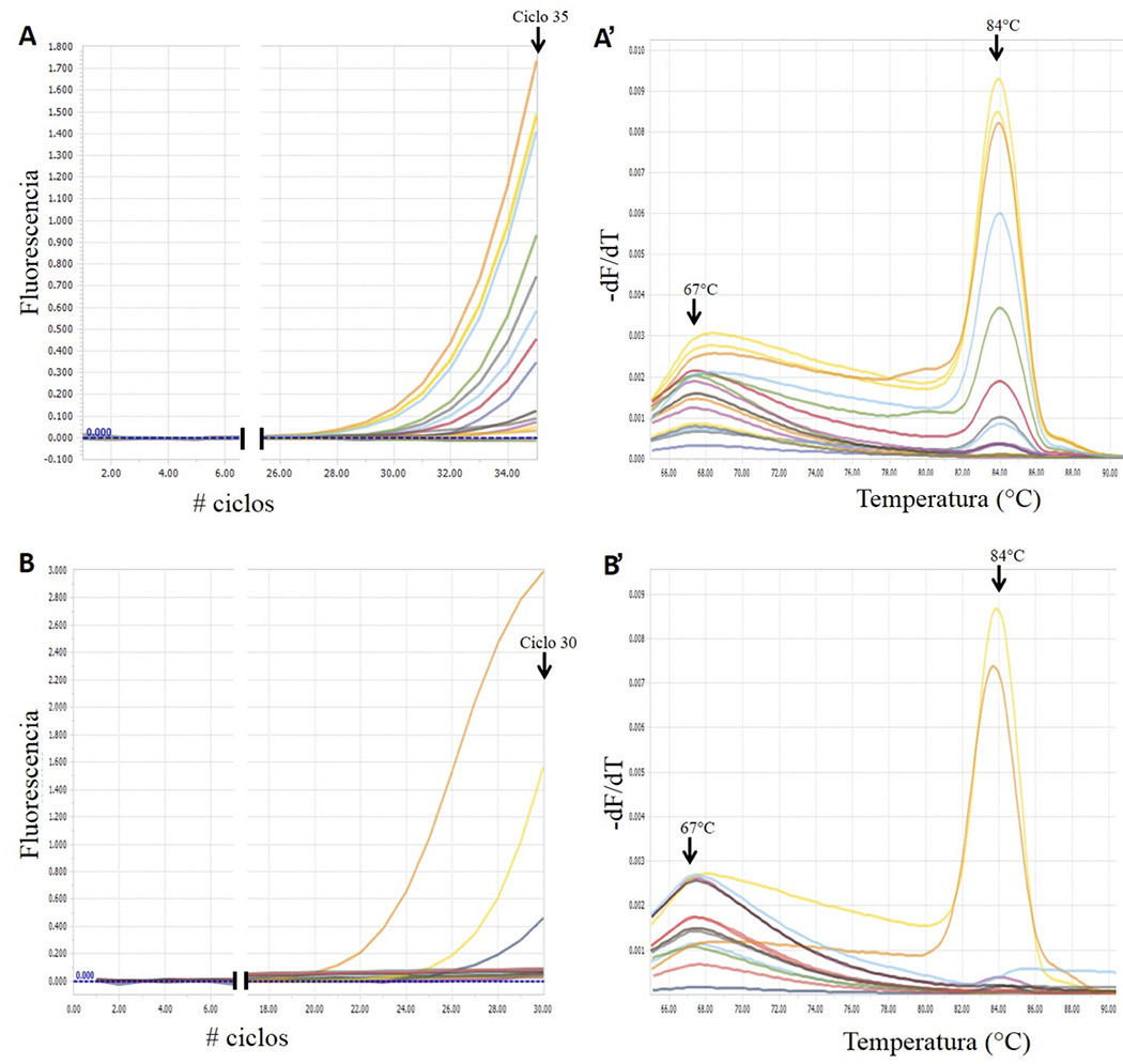 Figure 3. SYBR®Green real-time PCR amplification curves by 35S-F/35S-R primers to detect the specific sequence of the 35S promoter derived from GMO present in food for human and animal cosumption, obtained from commercial establishments in the provinces of Heredia, Cartago, and San José, Costa Rica in August 2016, and in cotton plants (Gossypium sp.) collected in May of 2017 in the district of Chomes, Puntarenas, Costa Rica. A and B) Samples M-27 through M-54 and cotton seeds (Gossypium sp.) samples B-01, 02 and 03. A’ and B’) Melting curves profiles for PCR products indicating specific amplification of the 35S product for food and cotton seed samples, respectively. Y-axis shows the inverse first derivative for the best-adjustment curve of the fluorescence decay (-dF/dT). Arrows depict the melting point and the Ct value used to discriminate a positive from a negative result of the real-time PCR amplification.
