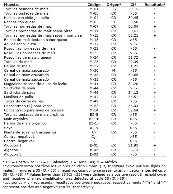 El valor de concentración del ADN total obtenido de las muestras de semillas de algodón (B-01, B-02 y B-03), tortillas tostadas (B2-5), maíz (B2-16) y harina (B2-17), mostró un intervalo de variación de 46,1 a 915,5 ng µl-1 debido a la naturaleza de la matriz analizada. En el perfil de ADN genómico se visualizó material genético íntegro de alto peso molecular, con excepción de las muestras B-03, B2-5 y B2-17, que mostraron ADN parcialmente degradado (datos no mostrados). La detección de trazas de ADN de la secuencia promotora 35S como indicador de transgenicidad se muestran en el Cuadro 1. Se evidencia que, de veintisiete alimentos procesados y evaluados en este estudio, quince resultaron positivos para la presencia del promotor transgénico 35S (59 % de las muestras analizadas), con valores de Ct entre 29,15 y 34,13. Por otro lado, las muestras analizadas de tortillas tostadas orgánicas (B2-5) producidas en Costa Rica, así como el maíz (B2-16) y la harina de maíz (B2-17) utilizadas para manufacturar la muestra B2-5, evidenciaron resultados negativos de amplificación de trazas transgénicas del promotor 35S (Ct >35). Lo anterior sugiere una ausencia preliminar de modificación genética en el maíz orgánico evaluado. En cuanto a las muestras provenientes de las semillas de algodón, se comprobó que dos de las muestras contenían ADN transgénico correspondiente a las muestras de algodón B-01 y B-02, para las cuales se obtuvieron valores de Ct de 21,93 y 26,13, respectivamente. Únicamente la muestra de algodón B-03 mostró ausencia de la secuencia transgénica 35S (Ct >35). Estos resultados sugieren una potencial dispersión de semillas GM (muestras B-01 y B-02) fuera del área restringida para el cultivo de algodón transgénico; lo que refleja un eventual vacío en el sistema de control de dispersión y bioseguridad de OGM.