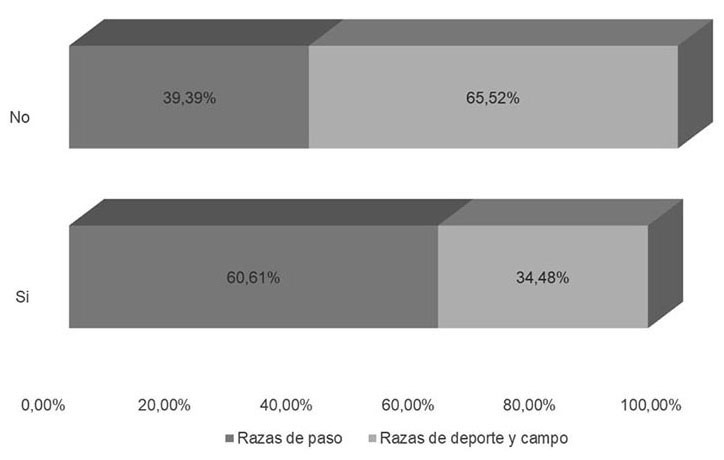 Los encuestados que afirmaron observar comportamientos estereotípicos en los caballos fueron 48,38 %. En el caso de los caballos Costarricense de Paso, un 60,61 % de los encuestados indicaron haber visto conductas estereotípicas, mientras que en caballos de razas de campo y deportivas, solo un 34,48 % las observó (Figura 1).