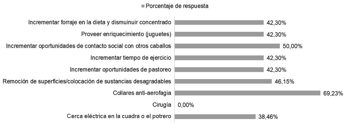 A las personas que reportaron haber observado comportamientos estereotípicos en sus caballos se les consultó si habían intentado detener estos comportamientos por medio de alguna técnica; a lo cual un 89,65 % respondió que sí. Los porcentajes de uso de técnicas comunes para disminuir la presentación de estereotipias en caballos reportadas por los encuestados se muestran en la Figura 3, siendo las técnicas más utilizadas los collares anti-aerofagia y el aumento de las oportunidades de contacto social con otros caballos.