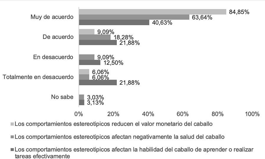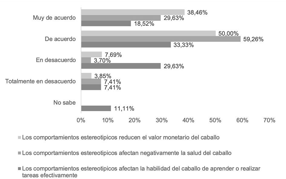 Se encontró un consenso en los encuestados con respecto al impacto que los comportamientos estereotípicos producen sobre la capacidad del caballo de aprender, entrenarse y realizar tareas efectivamente. Los efectos negativos sobre la salud del caballo y su disminución en valor monetario (precio de venta del ejemplar), fueron mencionados igualmente por los encuestados como relevantes por los costos asociados y la dificultad en la venta de animales. La relevancia de que los encuestados percibieran dichas implicaciones, se considera positivo, pues pueden tomar medidas de mayor trascendencia para prevenir o erradicar este tipo de comportamientos. Según Wickens (2009) en muchas ocasiones esto puede llevar a aumentar las posibilidades de pastoreo, generar mayor contacto social con otros caballos, usar cuadras de mayor tamaño y, por lo tanto, procurar un mayor bienestar en los animales.