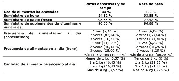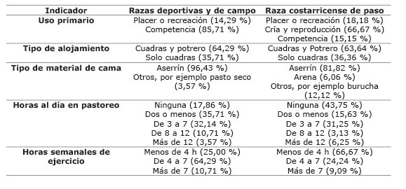 Dentro del manejo de la raza Costarricense de Paso se indicó como uso primario la cría, reproducción y venta de ejemplares, mientras que caballos de razas Cuarto de Milla, Apaloosa y Pinto Americano se utilizaban principalmente para competencia (en rodeos y actividades equinas) (Cuadro 1). El uso primario es un factor que influye en muchas ocasiones sobre el tipo de manejo que recibirá el animal.