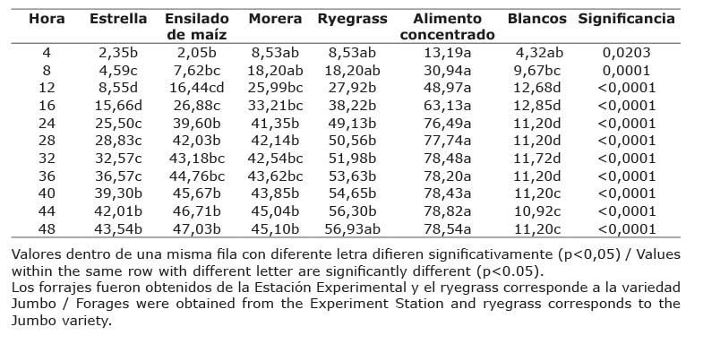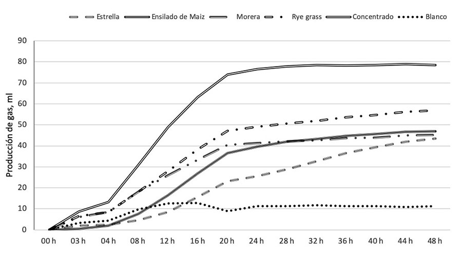 El alimento concentrado en todos los intervalos registró el mayor volumen de gas producido, el ensilado de maíz a las 4 h de incubación mostró el menor volumen de gas acumulado, el pasto estrella a partir de las 8 h de incubación reportó el menor volumen de gas producido entre los alimentos evaluados. El inóculo, licor ruminal sin sustrato, a las 12 h de incubación estabilizó su producción de gas, y a partir de ese momento conformó el grupo con menor volumen de gas acumulado. A partir de las 24 h de incubación el ensilado de maíz, morera y pasto ryegras conformaron el grupo intermedio, excepto a las 32, 36 y 48 h que el pasto ryegrass conformó un grupo diferente (Cuadro 3).