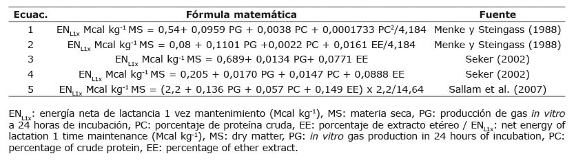Se contó con veinte ecuaciones basadas en la producción de gas que estimaban el contenido de energía neta de lactancia, de estas se seleccionaron las cinco ecuaciones con mayor precisión en la estimación deENL respecto al método NRC (2001) (Cuadro 1).