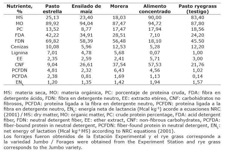 Los alimentos evaluados respecto a su composición química representaron valores típicos y entre estos, la variabilidad permitió la heterogeneidad en estas características. La menor concentración de proteína cruda la registró el ensilado de maíz y la mayor el pasto ryegrass, el valor de FDN varió con menor contenido en el alimento concentrado y la mayor concentración en pasto estrella, el contenido de carbohidratos no fibrosos fue superior en el alimento concentrado y menor en pasto estrella. El menor contenido de cenizas se encontró en el alimento concentado, mientras que el mayor se obtuvo en pasto ryegrass; la menor proporción de extracto etéreo se obtuvo en el pasto estrella y la mayor en el alimento concentrado. Las concentraciones menores de lignina se registraron en el alimento concentrado y las mayores en el pasto estrella; el contenido de proteína ligada a la fibra en detergente neutro fue superior en morera y menor en el ryegrass, el cual también presentó el menor valor de proteína ligada a la fibra en detergente ácido (Cuadro 2).