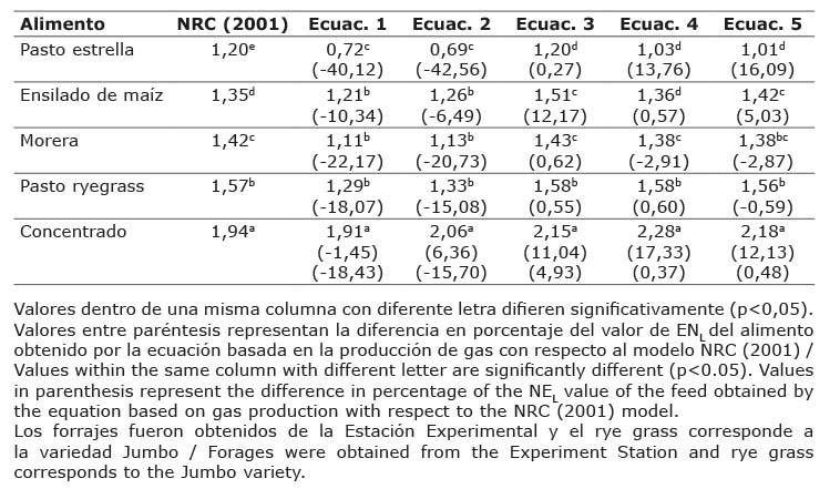 Al aplicar las ecuaciones del modelo NRC (2001) se agrupó a los alimentos en estudio en cinco grupos a partir de la prueba de Tukey, cada alimento representó un grupo diferente (Cuadro 4), en orden descendente el valor de ENL fue: alimento concentrado para vacas lecheras, ryegrass, morera, ensilado de maíz y pasto estrella.