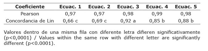 La aplicación de la correlación de concordancia (Lin, 1989) mostró mayor correspondencia que el uso de correlación lineal de Pearson (1895), como ejemplo (Cuadro 5) las ecuaciones 1 y 2 expresaron diferencias respecto al valor de referencia de -18,43 y -15,70%, respectivamente, el coeficiente de determinación de la correlación lineal de Pearson fue de 0,97 y la correlación de concordancia de Lin de 0,66 y 0,69, estos resultados (Cuadro 5) sugieren que la reproducibilidad de métodos mejora su evaluación mediante la correlación de concordancia de Lin, la correlación de Pearson sobreestimó el desempeño predictivo de las ecuaciones basadas en la PGIV y el método NRC para determinar ENL. El modelo de regresión o el coeficiente de correlación son insuficientes o incorrectos en la evaluación de concordancia y fiabilidad al aplicar dos o más métodos (Carrasco y Jover, 2004), para comparar diferentes métodos midiendo la misma variable es más apropiado el uso del índice de concordancia de Lin que la correlación de Pearson, este último puede expresar coeficientes de determinación muy altos, que al graficarse son detectables diferencias importantes entre métodos (Zar, 2010).