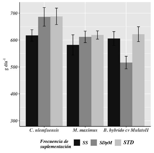 Figure 1. Daily gain weight by supplementation frequency and pasture interaction in Brahman steers. Turipaná Research Center, Corporación Colombiana de Investigación Agropecuaria (AGROSAVIA). Cereté municipality, Colombia. 2016.