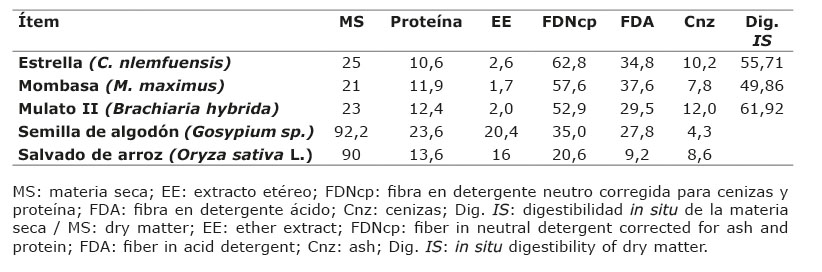 En cada pastura, se tomó una muestra representativa simulando pastoreo (hand plucking) para la determinación química de: cenizas (AOAC 942.05) proteína cruda (PC, AOAC 960.52 y 2001.11), fibra en detergente neutro (FDN, AOAC 2002.04), fibra en detergente ácido (FDA, AOAC 973.18) (Van-Soest et al., 1991), extracto etéreo (AOAC 973.18), según la AOAC (1995) y digestibilidad in situ de la materia seca (Ørskov et al., 1980). Todos los análisis se llevaron a cabo en el laboratorio de Nutrición Animal de AGROSAVIA Centro de Investigación Turipaná.